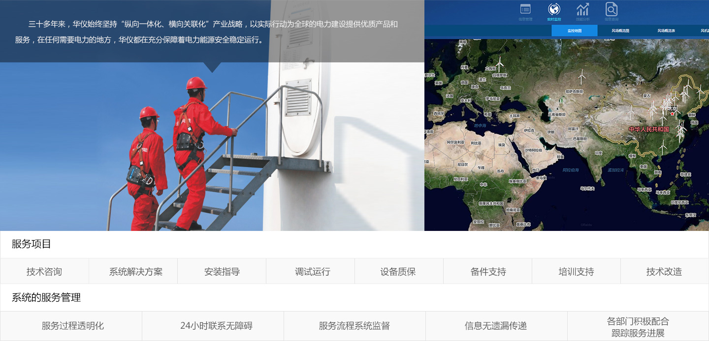 華儀始終致力于成為“國際一流的綠色能源綜合解決方案提供商”,在海內外主要城市均設有各類營銷網點,是國家電網公司、南方電網公司、五大發電集團等優質供應商,為電力、石油化工、冶金、鐵路、核電、軌道交通、市政及環保工程、金屬與非金屬礦山等行業用戶提供從方案設計、產品選型、EPC工程總包到售后服務的全過程系統解決方案,充分保障著電力能源安全穩定可靠的運行。